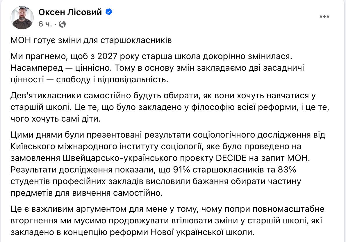 Тепер українським школярам доведеться вчитися не 11 років, а 12, завдяки впровадженню трирічної профільної середньої освіти, повідомив міністр освіти України Оксен Лісовий.