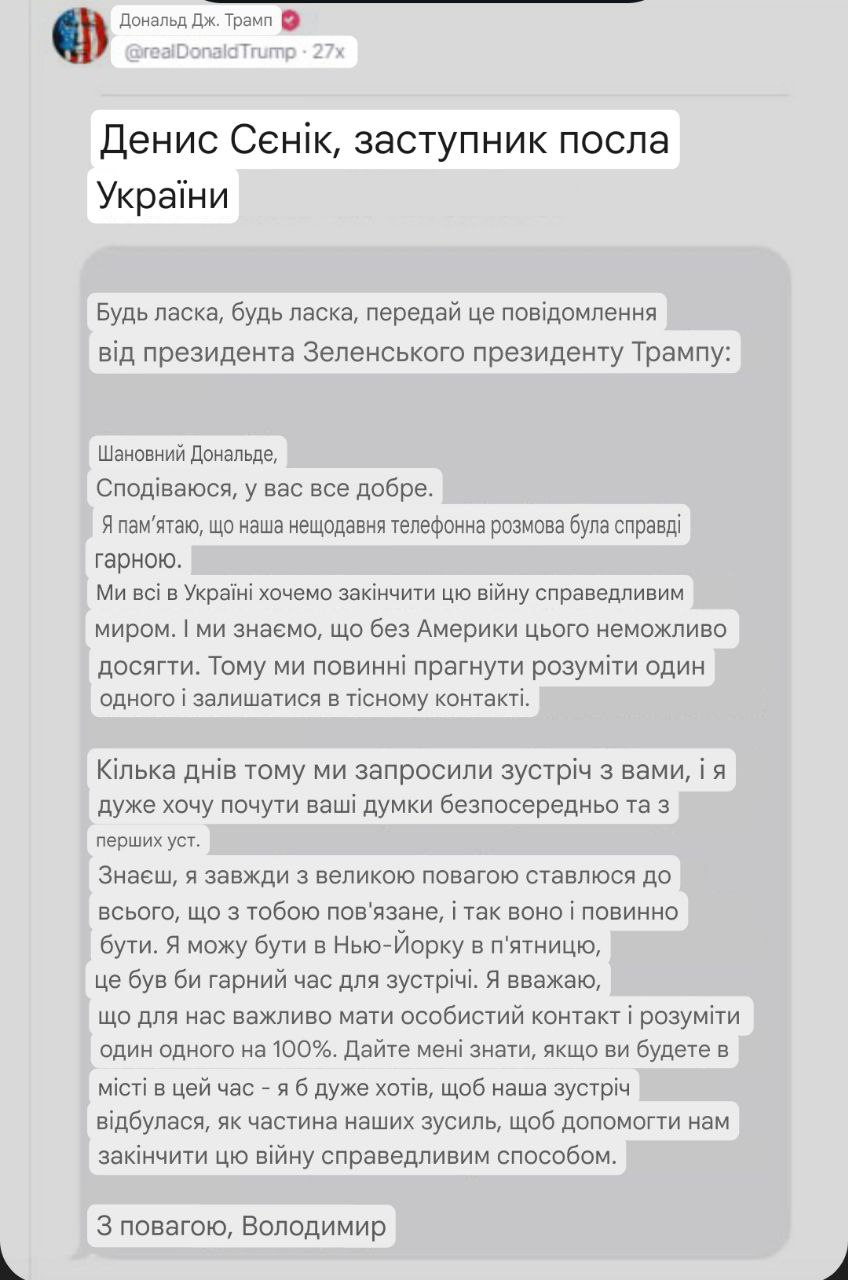 Трамп оприлюднив на своїй сторінці повідомлення від Зеленського з проханням про зустріч в п’ятницю.