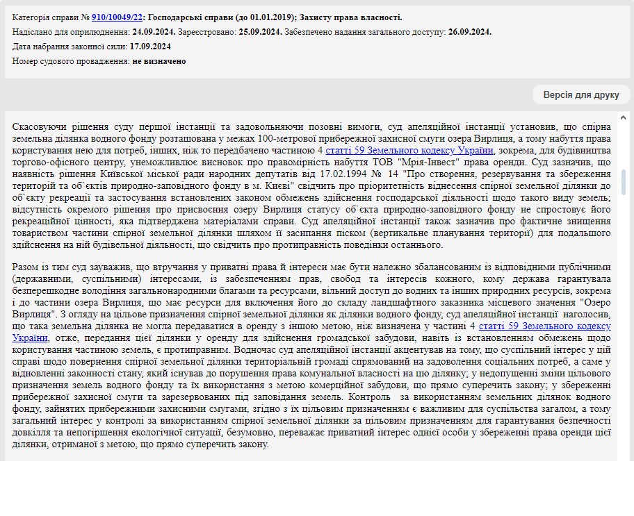Так, за інформацією прокуратури, ще у 1994 році Київрада прийняла рішення включити озеро Вирлиця до переліку об’єктів, що резервуються для заповідання. При цьому, на переконання позивачів, на Публічній кадастровій карті чітко видно, що вищезгадана земельна ділянка фактично є частиною вказаної водойми, а тому, мовляв, на неї також розповсюджується цей “резерв”. У зв’язку з цим, як вважають в прокуратурі, столична міськрада, передавши цю ділянку в оренду ТОВ “Мрія-Інвест”, незаконно змінила її цільове призначення, адже такі землі мають особливий статус і спеціальний режим – навіть не дивлячись на те, що рішення про встановлення на ній природоохоронного режиму остаточно ще не було прийнято.