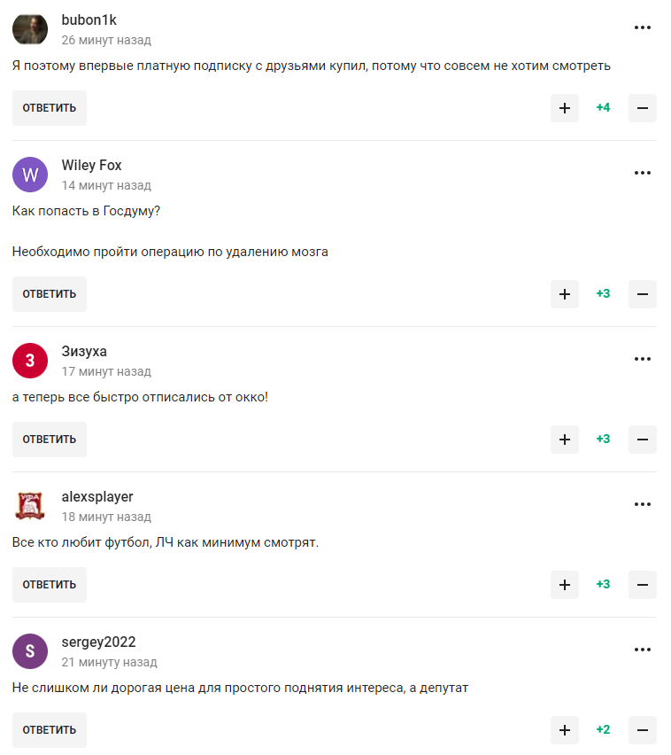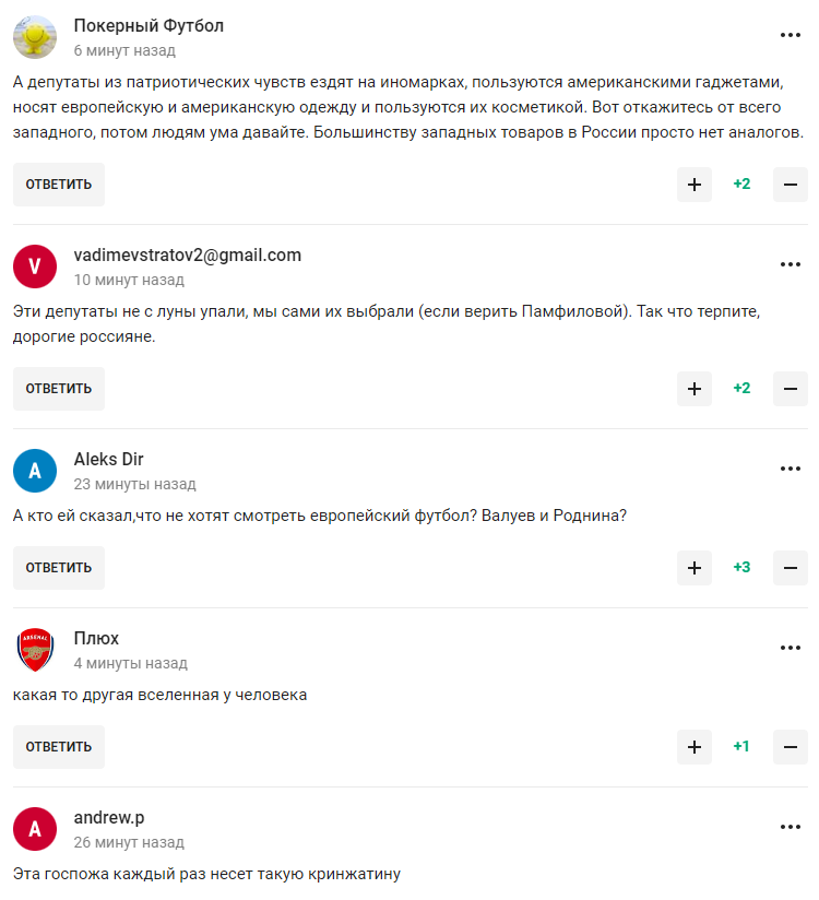 "А депутати з патріотичних почуттів їздять на іномарках, користуються американськими гаджетами, носять європейський та американський одяг та використовують їх косметику", "А хто їй сказав, що не хочуть дивитися європейський футбол? Валуєв і Родніна?", "Ця пані постійно говорить таку нісенітницю", "Журова, яка втратила здатність до критичного мислення, запевняє нас, що ми нібито не дивимося європейський футбол", "Якийсь інший світ у цієї людини", – пишуть у коментарях.