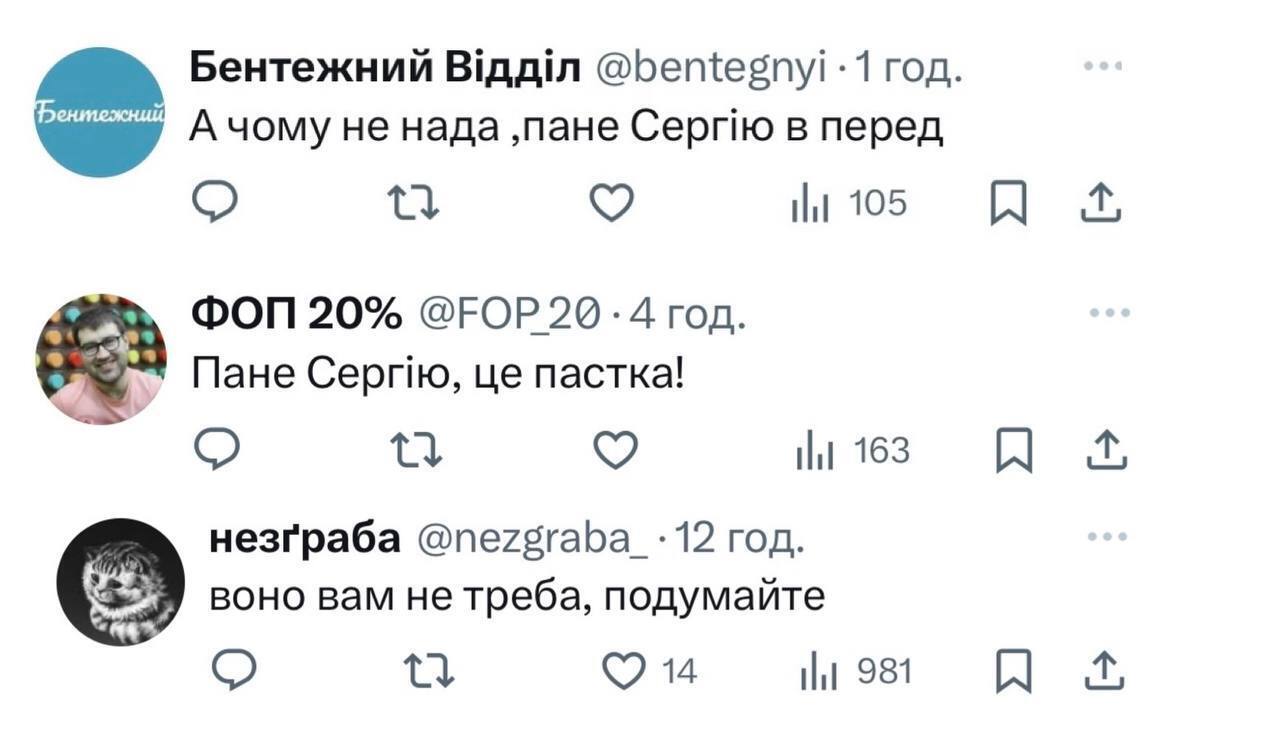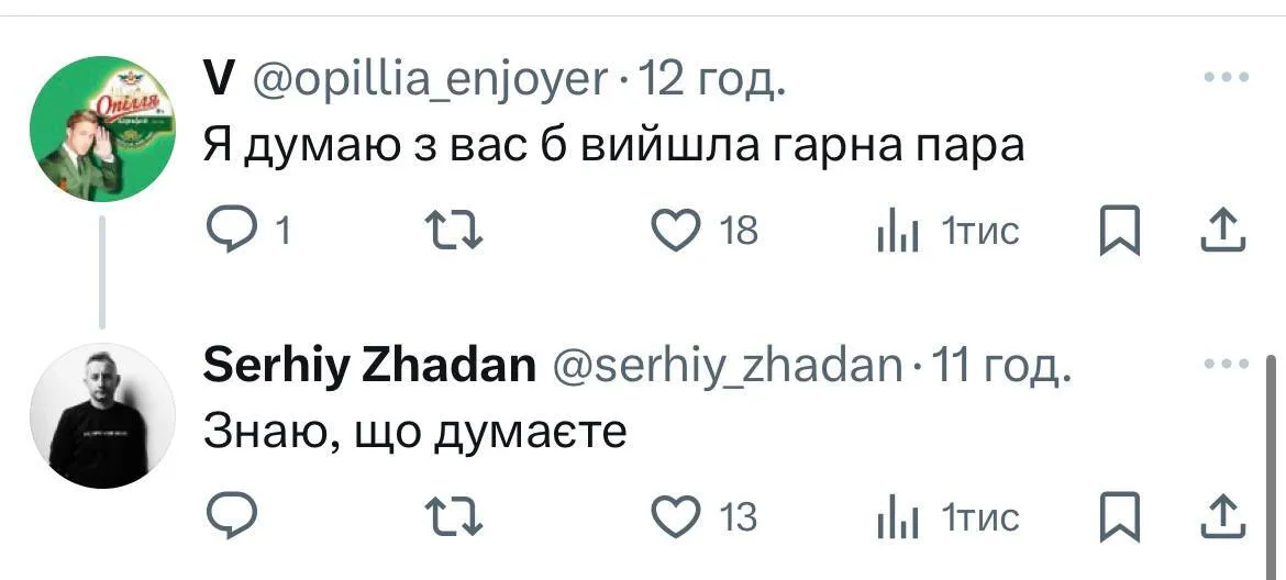 Проте знайшлися і ті, хто, ймовірно, досі не втрачає надії на возз’єднання зірок. Один із підписників зазначив, що вважає виконавців досить гарною парою, на що Сергій Жадан відповів: "Знаю, що думаєте".