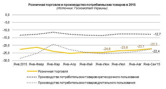 Говорити про реальну стабілізацію при рівні споживчої інфляції (Consumer Price Index) в 49,9% у січні-вересні нинішнього року (по відношенню до цього ж періоду в 2014 році) дуже складно. Ціни на продукти харчування та безалкогольні напої зросли за той же період на 47%, а комунальні послуги (житло, вода, електроенергія, газ) продовжують свою стрімку динаміку, досягнувши зростання в 119,9% за той же період.