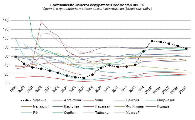 Співвідношення загального державного боргу до ВВП України 2015 року може досягти 95% через девальвацію національної валюти та процес рекапіталізації банківської системи країни, що в рамках програми «розширеного фінансування» є проблемою, адже перевищить «маяк» МВФ на 90 базисних пунктів.