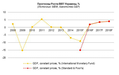 Зниження ВВП 2015 року може бути зафіксовано в діапазоні 12-13%, 2016 року зростання ВВП може становити не більш як 0,7-1%, а 2017 року ми вже можемо побачити збільшення цього показника на 3-4%. Це оптимістичніша оцінка для 2015 року й песимістичніша - для 2016-го, якщо порівнювати з прогнозами агентства Standard & Poor’s.