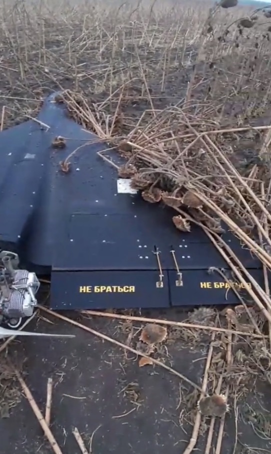 "Великий. Метрів три в довжину і метрів три в ширину", — говорить чоловік у ролику. На безпілотнику чорного кольору можна побачити написи російською "не братись" на крилах.
