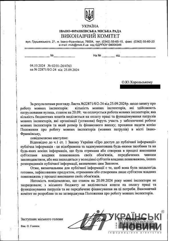 «Станом на 20.09.2024 мовні інспектори не приступили до роботи. Кошти з міського бюджету не виділяються на оплату праці та функціонування патрулів, а також не передбачено фінансування для цих цілей», — написав Федорів.