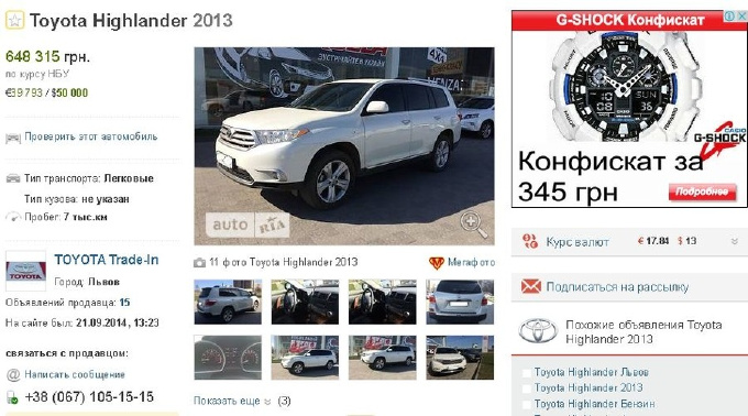 На вторичном рынке подобный внедорожник Toyota Highlander, 2013 года, в зависимости от комплектации можно купить от 650 до 790 тысяч гривен.