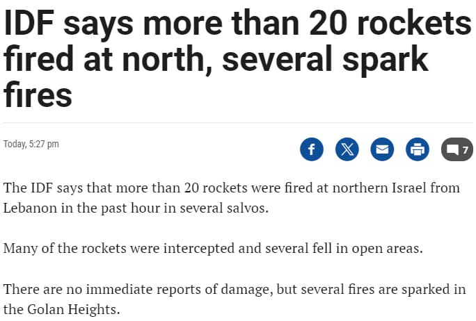 За заявами ізраїльської армії, протягом години було зафіксовано близько 20 ракетних запусків з території Лівану.