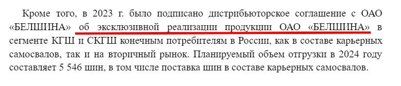 З липня 2023-го «Белшина» та «БелАЗ» вели переговори, випливає із документів, якими з нами поділилося Об’єднання колишніх силовиків Білорусі BelPol. У тому ж році компанії підписали дистриб’юторську угоду про ексклюзивну реалізацію великогабаритних та надвеликогабаритних шин «Белшини» кінцевим споживачам у Росії. При цьому «Торговий дім БелАЗ» купував у «Белшини» надвеликогабаритні шини для російського ринку за ціною, нижчою за ту, яку вона пропонувала своєму нижегородскому торговому дому.