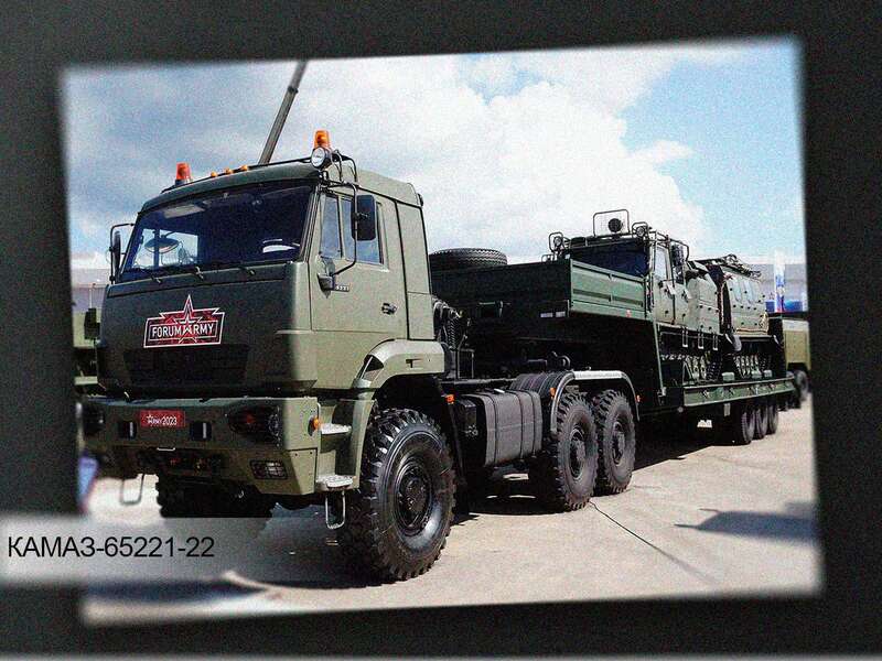 Ще одна зброя війни на форумі «Армія-2023» у «взутті» від «Бєлшини» — тягач БАЗ, пристосований під російську систему протиповітряної оборони С-400.