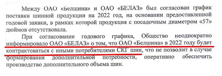 Тобто компанії уклали договір до початку повномасштабного вторгнення Росії в Україну, яке спричинило дефіцит надвеликогабаритних шин на російському ринку. За словами Лукашенка, гендиректор "Белшини" уклав контракт на ексклюзивне постачання шин з покупцем до РФ, коли «з російського ринку пішли західні конкуренти, і ціни на цю продукцію почали зростати». Крім того, «Белшина» постачала шини не лише «Імпоріа Тайєрс», а й власному «Нижегородському Торговому дому “Белшина”», причому ціни на деякі позиції для «Імпоріа Тайєрс» були вищими.