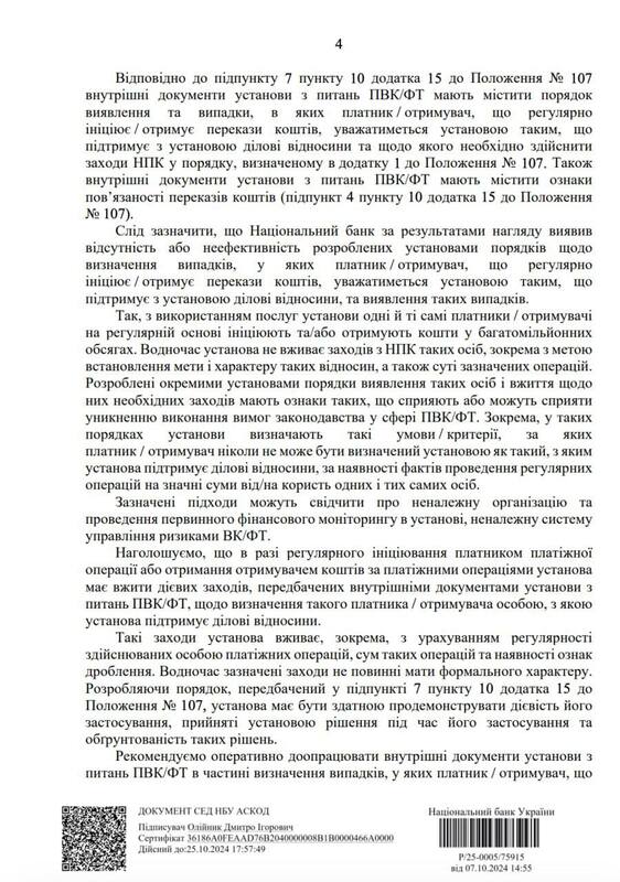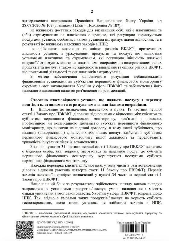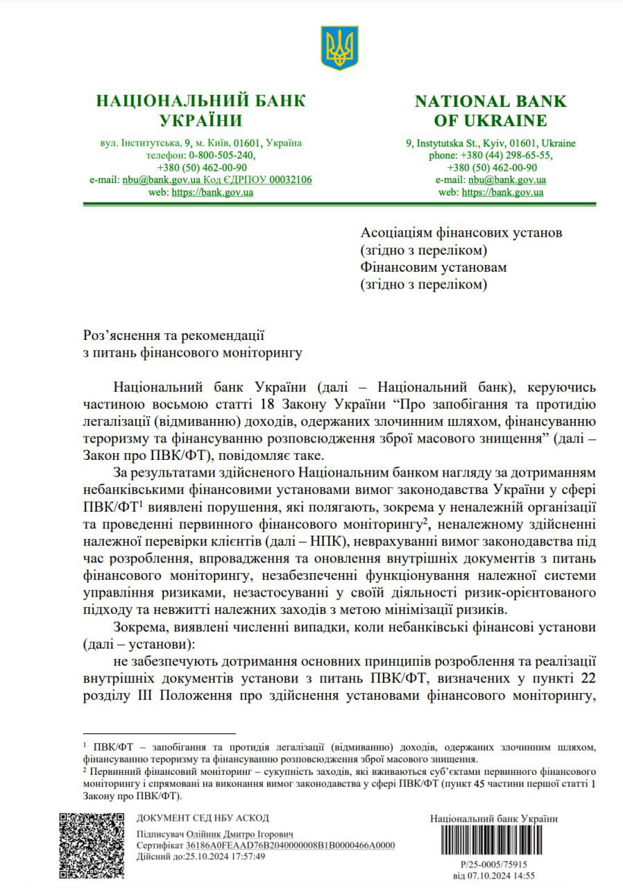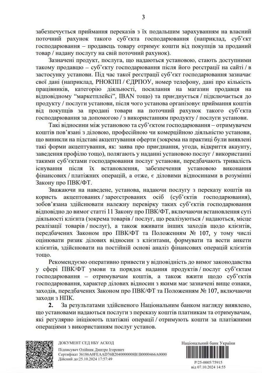 У ньому регулятор зазначає, що під час своїх перевірок переконався в тому, що небанківські фінучреждения, які здійснюють платежі, масово (зазначається «про численні випадки») порушують правила фінмоніторингу. Тобто не проводять фінансовий моніторинг партнерів і клієнтів, які регулярно здійснюють і отримують платежі через них. Зокрема, не проводять те, що влада називає «належною перевіркою клієнтів».