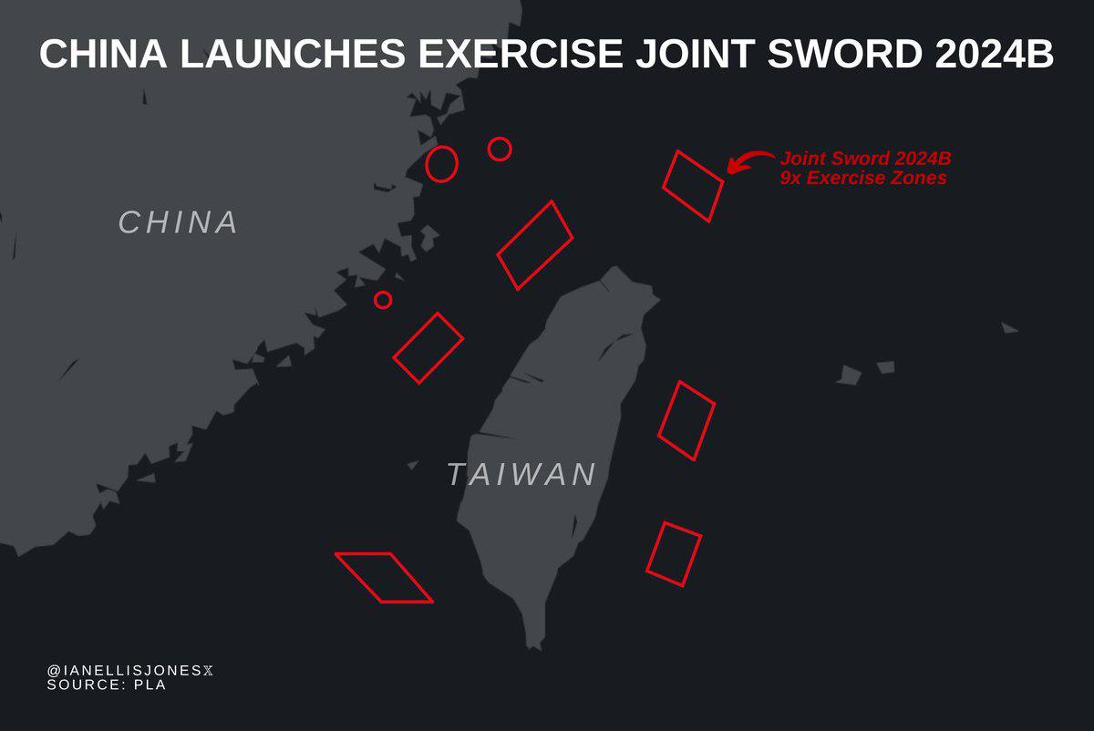 Навчання, названі Joint Sword-2024B, проходять у Тайванській протоці, а також у районах на північ, південь і схід від острова. Офіційна заява китайських військових підкреслює, що ці маневри є «законною та необхідною операцією для захисту державного суверенітету та національної єдності». Дата завершення цих навчань не вказана.