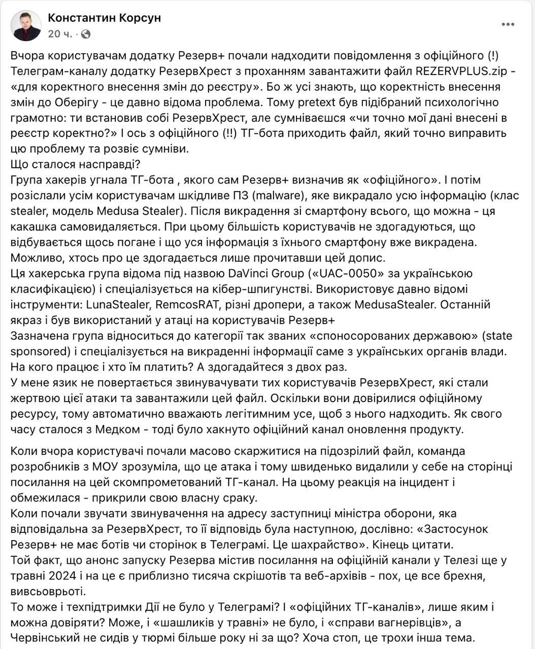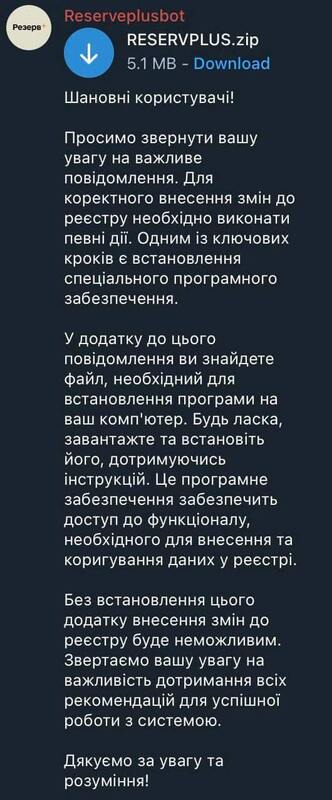 Зокрема, користувачам через обліковий запис @reserveplusbot надходять повідомлення про необхідність встановлення спеціального програмного забезпечення з прикріпленим архівом RESERVPLUS.zip.