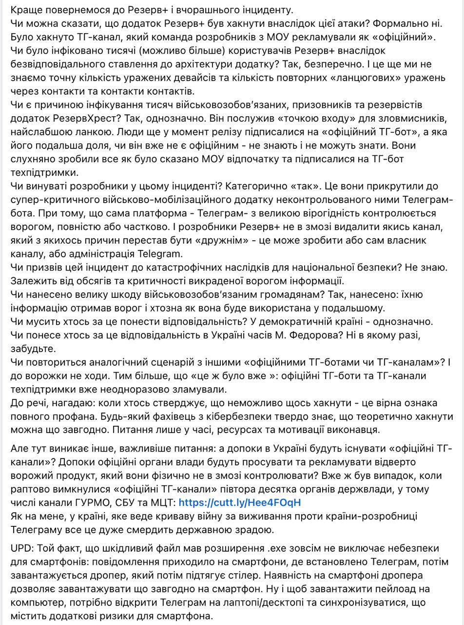 Урядова команда реагування CERT-UA отримала інформацію про поширення небезпечних повідомлень у Telegram нібито від технічної підтримки сервісу «Резерв+».