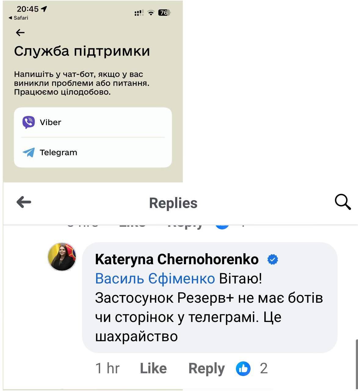 «Обліковий запис reserveplusbot створено під виглядом Телеграм-бота, який імітує технічну підтримку застосунку для призовників, військовозобов’язаних та резервістів «Резерв+». Слід зауважити, що такий обліковий запис у травні 2024 року дійсно зазначався як один із контактів технічної підтримки «Резерв+»», – йдеться в повідомленні.