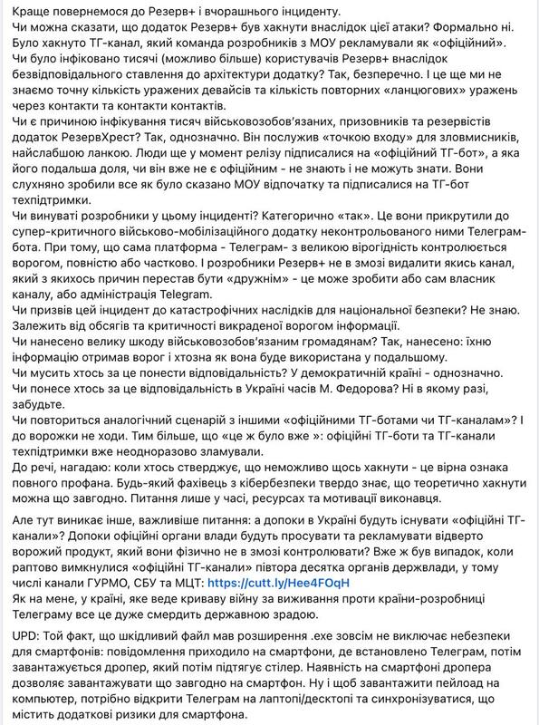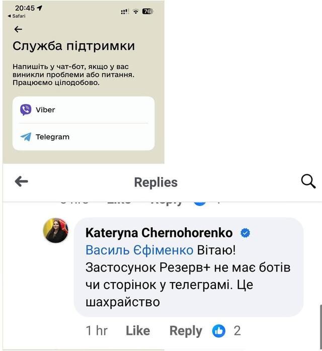 У Telegram розповсюджуються небезпечні повідомлення, які нібито надсилає «Резерв+»