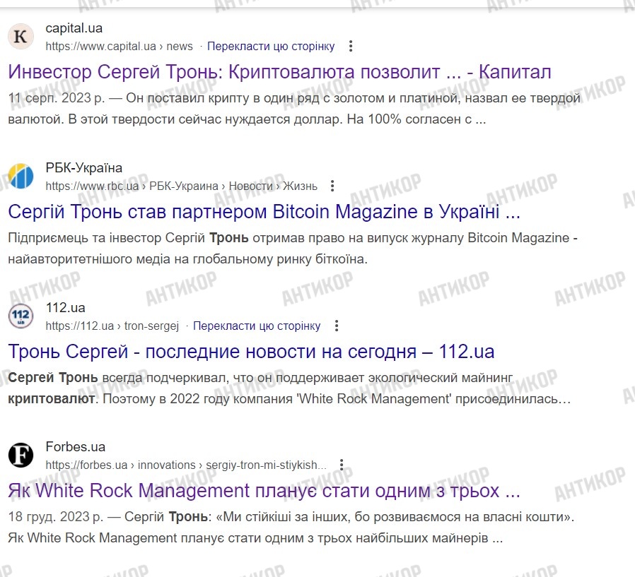 Мережа просто забита матеріалами, в яких фігурує Сергій Тронь – він здебільшого міркує про майбутнє криптовалют та дає поради космічного масштабу керівництву України, яким чином на цьому заробити мільярди для країни. Заодно розповідає захоплюючу історію про те, як залишився без батька і змушений був годувати сім’ю, але зміг піднятися та стати мільярдером. Причому почав він у 22 роки одразу з посади генерального директора фірми, що займається нафтопереробкою, оптовими поставками палива та транспортними перевезеннями. Ну а далі – пішло-поїхало, у результаті – мільйони доларів США. І все, зауважте, абсолютно чесним шляхом.