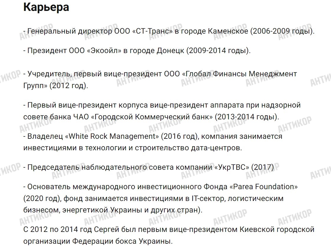 А тепер ще один факт із великої біографії Сергія Троня. Він сам особисто пише, що був "співзасновником, а згодом головою наглядової ради компанії "УкрТВС", яка займається виробництвом ядерного палива". Історія, як цю «УкрТВС» створили росіяни, а потім намагалися видавити через неї американську Westinghouse Electric з України – тут . У 2019 році Тронь за цю історію мало не сів, але врятувала зміна влади. І він виринув уже як криптоінвестор.
