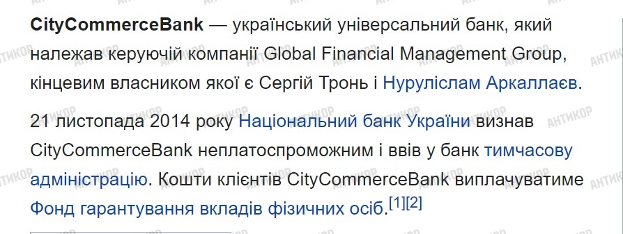І тут ніяк не оминути «Міський комерційний банк», де Сергій Тронь був віцепрезидентом. До речі, Вікіпедія про це замовчує, але у статті, присвяченій Сергію Троню на цьому ресурсі, є приписка: «Нейтральність цієї статті під сумнівом. Стаття має яскраво виражений рекламний характер. Після вивчення долі банку, в якому Тронь працював віцепрезидентом, стає зрозуміло, чому він намагається не афішувати свою причетність до банку, який відомий під назвою CityCommerceBank, і був збанкрутований у 2014 році. Попередньо з банку викачали принаймні три мільярди гривень у грошах 2013 року, тобто щонайменше 375 мільйонів доларів. Сергій Тронь був не просто його віцепрезидентом – він був серед його власників. Спільно із Нурулісламом Аркаллаєвим.