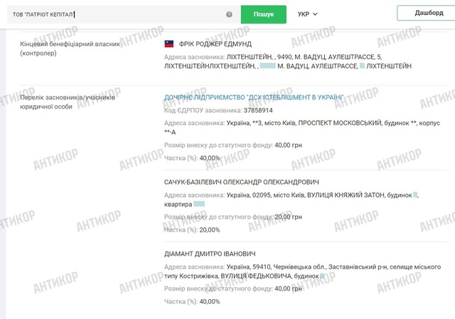 Власниками ТОВ «Патріот Кепітал» є Фрік Роджер Едмунд, громадянин Ліхтенштейну, «дочка» фірми «ДСГ Істеблішмент» з того ж Ліхтенштейну, і двоє громадян України – Діамант Дмитро Іванович та Сачук-Базилевич Олександр Олександрович.