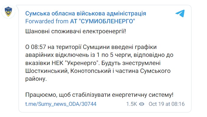 В ОВА також зазначили, що з 9-ї ранку на території Сумщини введено графіки аварійних відключень з 1 по 5 черги, відповідно до вказівки "Укренерго". Тимчасово буде знеструмлено Шосткинський, Конотопський та частину Сумського району.