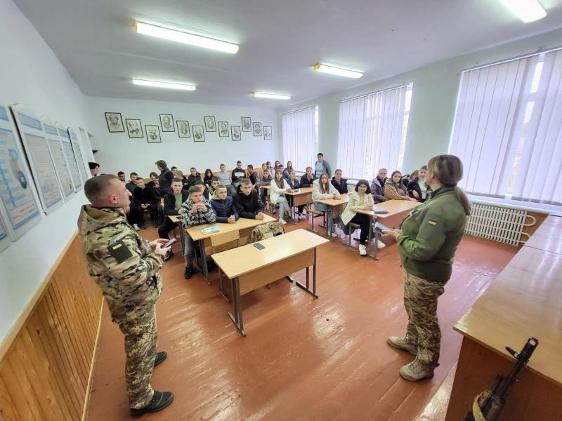 Військовослужбовці РТЦК та СП проводять зустрічі зі старшокласниками, під час яких розповідають про структуру ЗСУ, сучасні види озброєння та важливість захисту держави від загарбників.