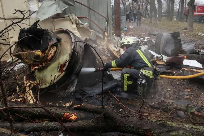 Пожежники гасять пожежу на залишках північнокорейської ракети КН-23 біля житлового будинку в Харкові, Україна 2 січня 2024 року (за місцевим часом). Фото: Reuters / Yonhap News