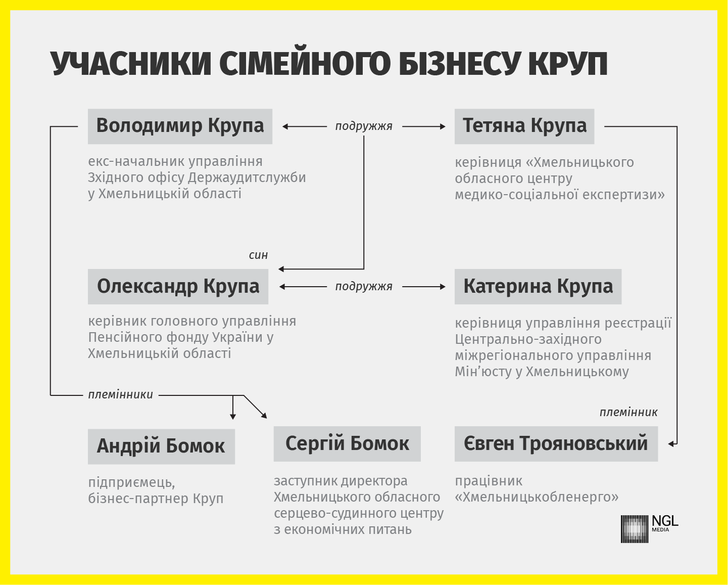 Після гучного затримання у Хмельницькому 64-річної Тетяни Крупи за підозрою у незаконному збагаченні, її син Олександр звільнився з посади керівника місцевого управління Пенсійного фонду і почав позбуватися бізнесу в Україні. Інші родичі, які теж працюють на державній службі, позакривали свої профілі у соцмережах і відмовчуються. Їм є що приховувати – мільйони доларів у цій сім’ї з’явилися не просто так.