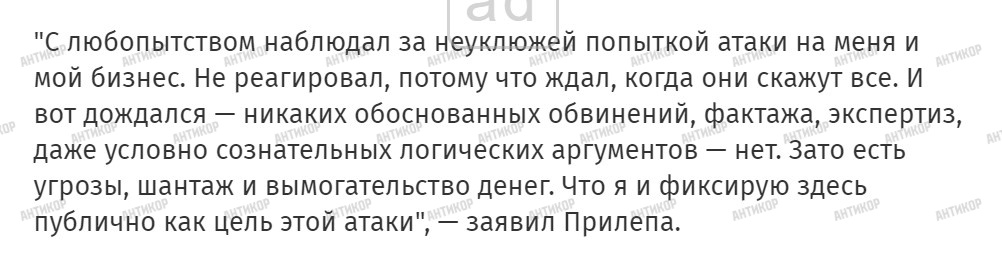 Звичайно, основи для таких заяв у Прилепи є – в його офіси в Україні прийшла СБУ з обшуками, і він явно ображений на своїх покровителів у високих кабінетах. Але, якщо ці обшуки й викликані бажанням забрати у Прилепи вкрадене, то це не єдина причина. Хто б не прикривав Богдана Прилепу і його аферу, а СБУ прийшла в його контору після того, як на біржі Coinsbit були заблоковані рахунки людей, які збирали гроші на дрони для ЗСУ. І Прилепа знав про ці збори та мав доступ до рахунків волонтерів. Після того, як там зібралася величезна сума, рахунки виявилися заблокованими. За даними ЗМІ, мова йде про мільйони доларів. До того ж ці гроші пішли до Росії, так що криптогаманці волонтерів порожні. А після цього взагалі «лягла» вся біржа.