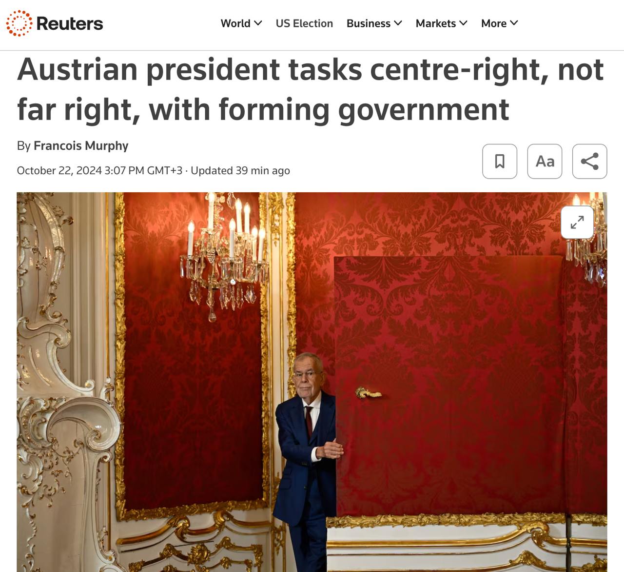 Як передає Reuters, президент Александер Ван дер Беллен доручив канцлеру Карлу Нойгаммеру, лідеру правоцентристської Народної партії (OVP), яка зайняла друге місце на виборах, сформувати коаліцію.