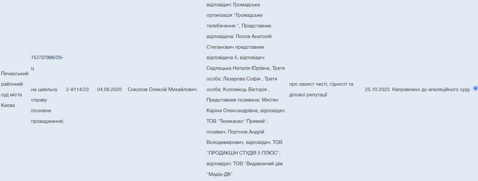 Судді Київського апеляційного суду Крижанівська, Онищук та Шпирук також підтримали рішення першої інстанції. Розгляд справи триває.