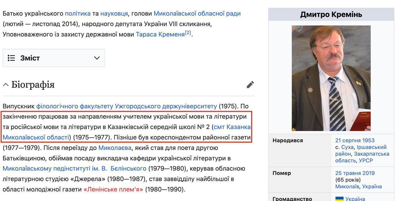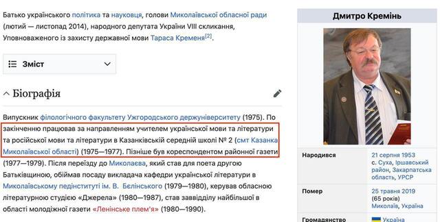 Після цього в мережі звернули увагу, що батько Кременя, Дмитро, працював учителем української та російської мов одночасно в одній зі шкіл Миколаївської області. Про це йдеться в його біографії у Вікіпедії.