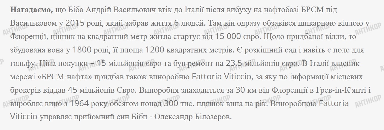 Той факт, що в Україні після 24 лютого 2022 року БРСМ, компанія любителів «русского мира» Андрія та Світлани Біби, не тільки не постраждала від санкцій, а, навпаки, розширила свої масштаби з продажу підробленого пального, вже нікого не дивує. Але цього, виявляється, мало – з квітня 2024 року Андрій та Світлана Біби добувають український газ і продають його українцям, забезпечуючи собі безбідне життя на найдорожчих курортах світу, куди родина втекла після вибуху на заправці БРСМ ще у 2015 році. Тоді Андрій та Світлана Біби оселились в Італії, де купили собі віллу у Флоренції й звідки продовжують керувати своїм бізнесом в Україні.
