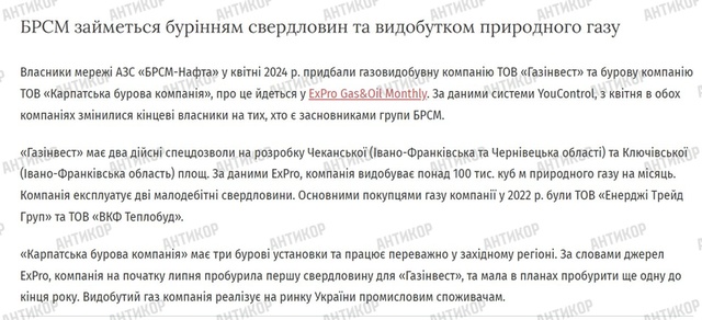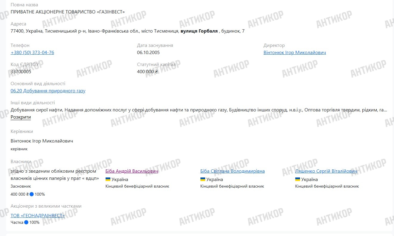 Факт купівлі Андрієм та Світланою Бібою двох фірм, які добувають газ, не вигадка і не фейк. Ось дані ресурсу Опендатабот щодо ПрАТ «Газінвест»: