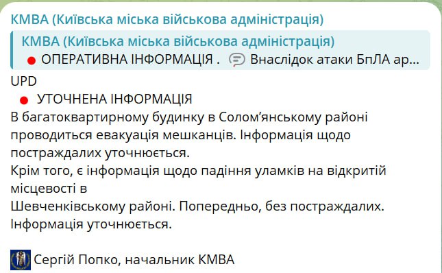 Також у КМВА є інформація про падіння уламків на відкритій місцевості в Шевченківському районі.