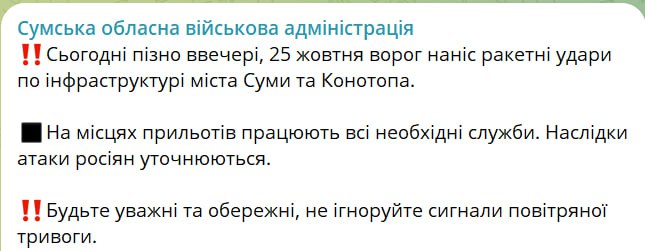 Військові РФ завдали ракетних ударів по інфраструктурі Конотопа та Сум.