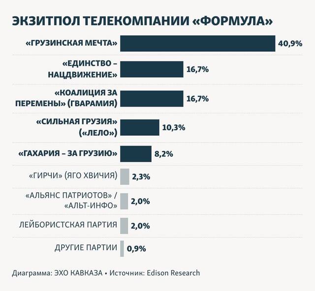 Цікаво, що у двох із трьох екзитполів партія Михайла Саакашвілі «Єдність-Національний рух» займає лише третє місце, поступаючись «Коаліції за зміни», яка відкололася від неї. У ще одному екзитполі вони йдуть майже ніздря в ніздрю.