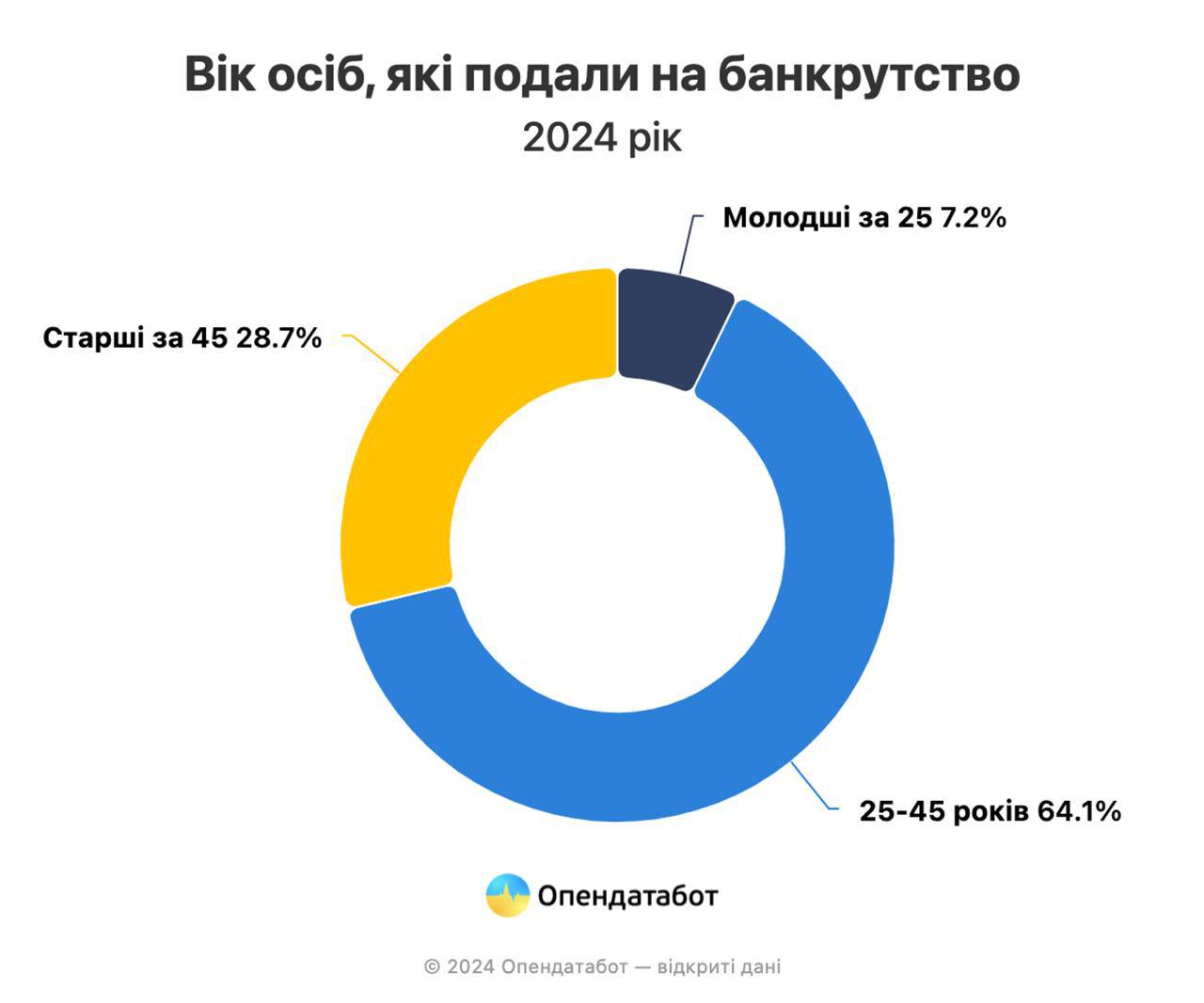 Найчастіше просять визнати себе неплатоспроможними, люди віком від 25 до 45 років — це 64,1% банкрутів. Ще 28,7% припадає на осіб старше 45 років.