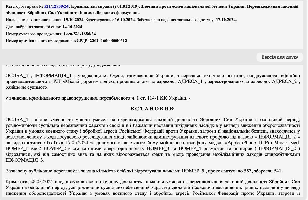 Малиновський районний суд Одеси засудив чоловіка до 5 років тюрми з випробувальним терміном 1 рік за розміщення в Тік-ток відео, де працівники ТЦК проводили "заходи з мобілізації".