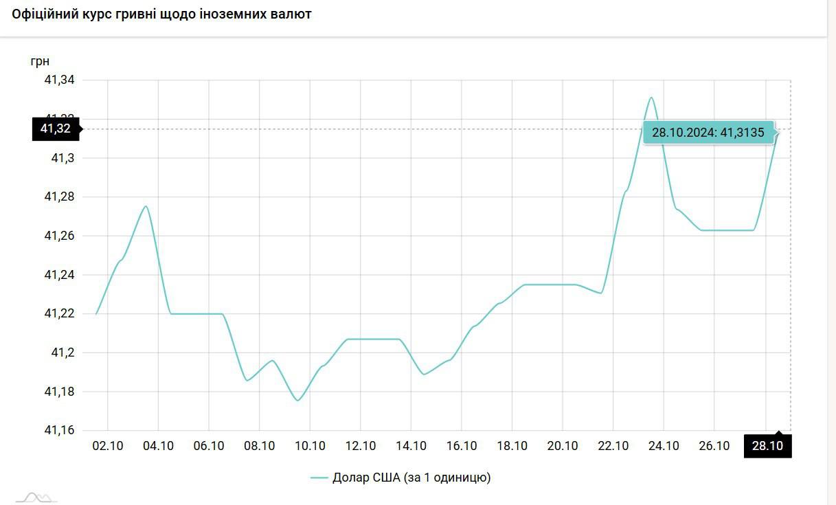 За підсумками торгів у понеділок Національний банк поки що підняв свій офіційний курс, здавалося б, незначно — з 41,32 грн/$ до 41,33 грн/$, і цей курс встановлено на завтра, 29 жовтня. Хоча всі пам’ятають, що минулого понеділка, 21 жовтня, він становив всього 41,23 грн/$.