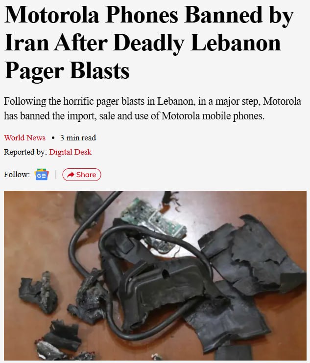 «Посилаючись на питання безпеки, всі смартфони та пейджери американського бренда Motorola будуть заборонені в Ірані і не зможуть бути зареєстровані в телекомунікаційних мережах країни. Інтернет-магазини в країні уже дотримуються нових вказівок, оскільки заборонені мобільні телефони Motorola показуються як «немає в наявності» на веб-сайтах та інших онлайн-платформах», – повідомляє видання.