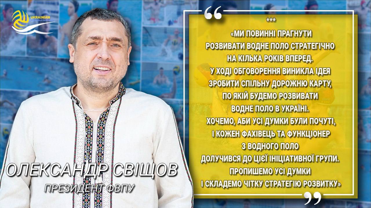 «Ми повинні прагнути розвивати водне поло стратегічно на кілька років вперед. Хочемо, щоб усі думки були почуті, і кожен фахівець та функціонер з водного поло долучився до створення спільної дорожньої карти розвитку нашого виду спорту», – зазначив Олександр Свіщов.