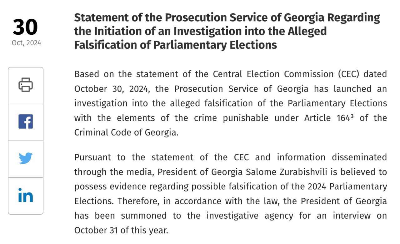 "Згідно із заявою ЦВК та інформацією, розповсюдженою в публічному просторі через ЗМІ, президентка Грузії Саломе Зурабішвілі повинна мати докази можливої фальсифікації парламентських виборів 2024 року, тому, відповідно до закону, президентку Грузії було викликано до слідчого органу 31 жовтня на допит", - зазначають у відомстві.