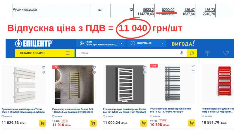 Рушникосушки заклали по 11 040 грн/шт. Львівський «Епіцентр» за таку ціну пропонує й асиметричні й золотисті та дизайнерські рушникосушки.