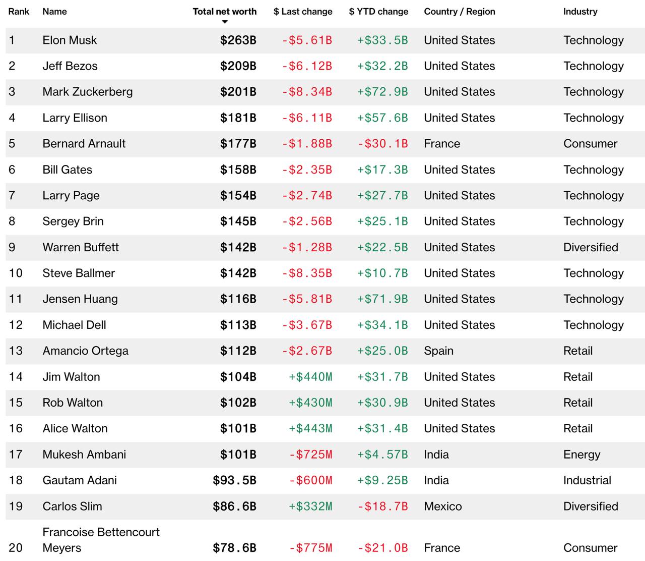 На першому місці - Ілон Маск. Його статки оцінюються в 263 млрд доларів, за рік він заробив 33,5 млрд.
