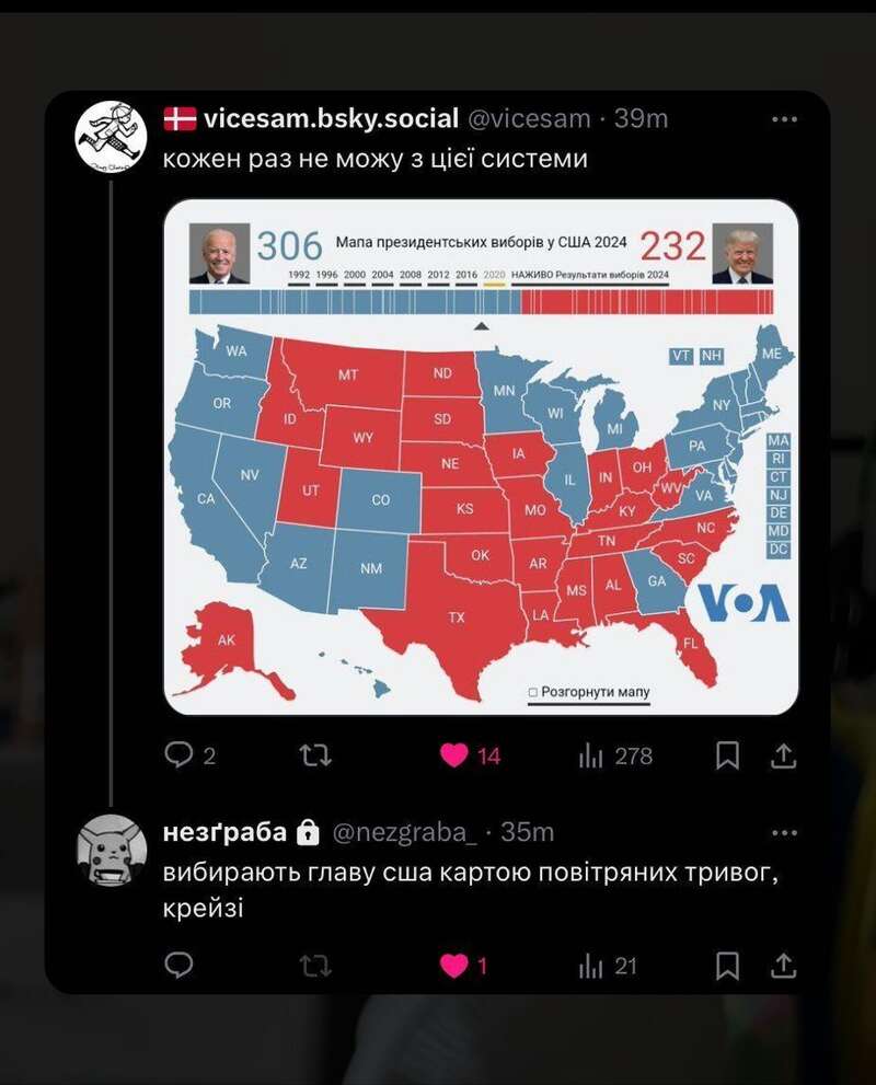 Рано вранці 6 листопада стали відомі перші результати президентських виборів у США. За ними, республіканець Дональд Трамп, за попередніми підрахунками, набрав понад 280 голосів, що перевищує мінімально необхідні 270 для перемоги над Камалою Гарріс.