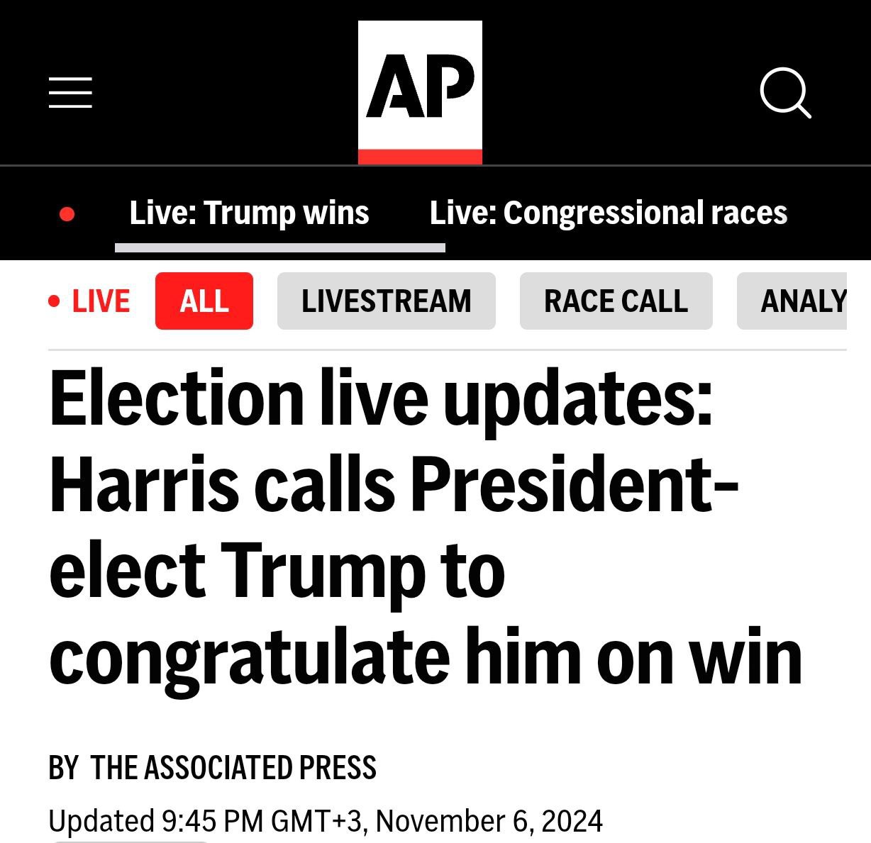 Гарріс зателефонувала Трампу, щоб привітати його з успіхом на виборах, і обговорила важливість мирної передачі влади та «значущість бути президентом для всіх американців». Розмова тривала всього кілька хвилин, повідомляє CNN.
