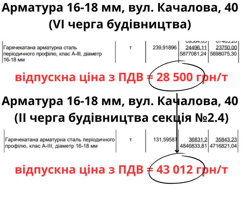 Аналогічна ситуація і щодо гарячекатаної арматурної сталі класу А-ІІІ діаметром 16-18 мм яку замовили по 28 500 грн/т, що нижче, ніж на ринку, та в 1,5 раза дешевше, ніж для секції № 2.4.