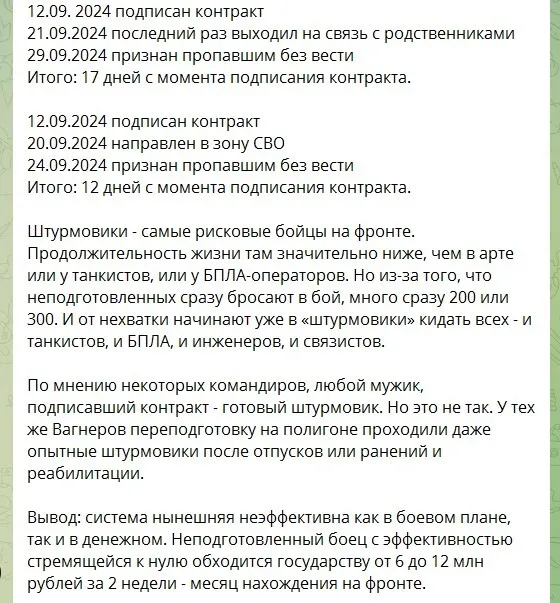 Зокрема, пропагандистка Анастасія Кашеварова 7 листопада висловила невдоволення тим, що штурмовики стали просто "витратним м’ясом". Зазвичай від моменту підписання контракту з міноборони РФ до загибелі на фронті проходить 12-17 днів.